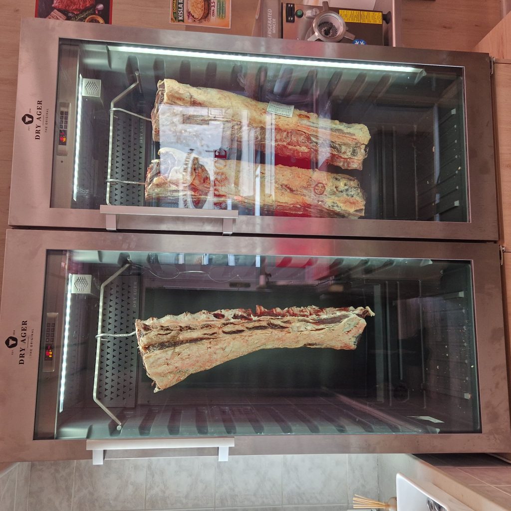 V posebnih zorilnih komorah zorimo goveje meso 40 dni, da razvije polnejši okus, mehkobo in vrhunsko teksturo.
